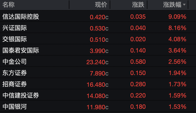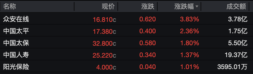 保險板塊,眾安在線上漲3.83%,中國太平上漲2.36%。中國太保(601601)、中國人壽(601628)和陽光保險漲幅超1%。券商板塊,信達國際、興證國際分別大漲9.09%、8.16%。