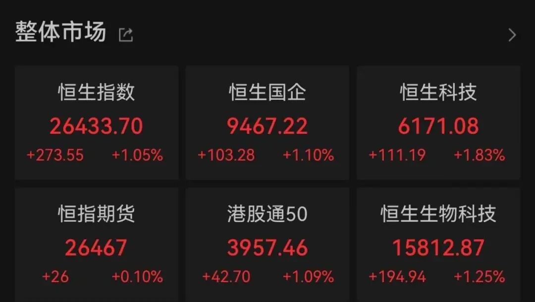 截至收盤,恒生指數漲1.05%,報收于26433.70點;恒生科技指數漲1.83%,報收于6171.08點;恒生國企指數漲1.10%,報收于9467.22點。盤面上,科網、券商、保險、半導體、醫(yī)藥等板塊走強。