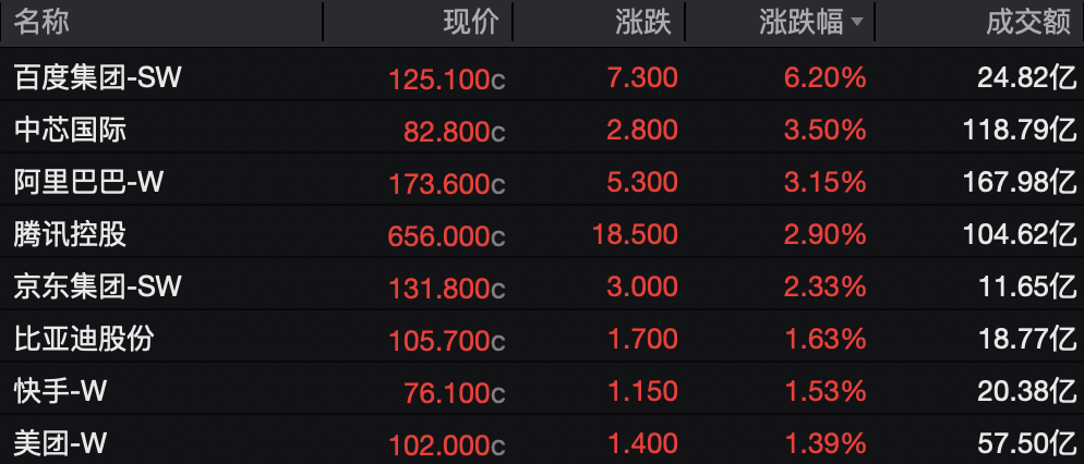 大型科網股普漲,助力大盤走高。百度大漲6.20%,阿里巴巴、騰訊、京東分別上漲3.15%、2.90%、2.33%。中芯國際、阿里巴巴、騰訊控股今日成交額超百億港元。