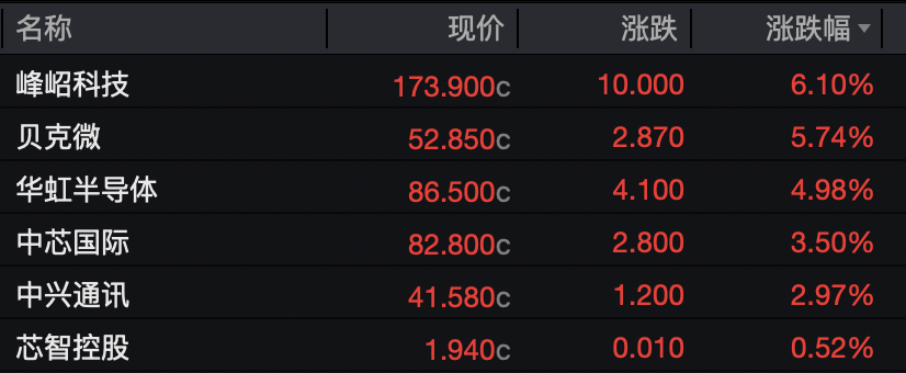 貝克微、華虹半導體、中芯國際分別上漲5.74%、4.98%、3.50%。