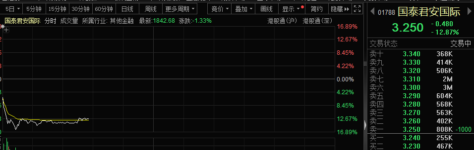 今年6、7月份那波行情當(dāng)中,國泰君安國際可謂是風(fēng)頭無兩。在不到一個月的時間里,該股漲了將近600%,但隨后開啟持續(xù)調(diào)整行情。今天,該股迎來暴跌,股價一度跌近17%。