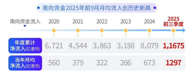 第二,南向資金持續(xù)流入,增配空間廣闊。2025年前三季度,南向資金累計(jì)凈流入達(dá)1.16萬(wàn)億港幣,已超去年全年水平,月均流入創(chuàng)歷史新高。從存量角度看,當(dāng)前全市場(chǎng)可投資港股的主動(dòng)偏股型基金對(duì)港股的配置比例為28.7%,若提升至50%的上沿區(qū)間,預(yù)計(jì)仍有約3940億港幣的增配空間。保險(xiǎn)、私募及個(gè)人投資者的資金也在加速進(jìn)場(chǎng),預(yù)計(jì)全年非公募資金增量或達(dá)3924億港幣。