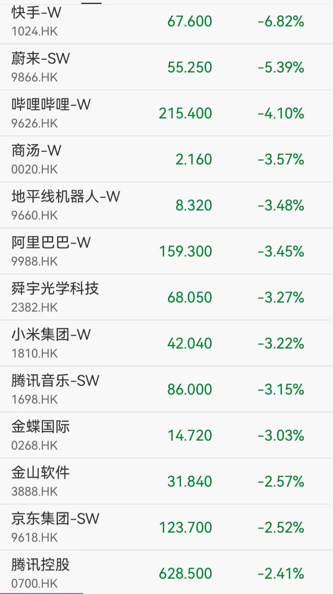 權(quán)重科技股集體弱勢,快手-W跌近7%,蔚來-SW跌超5%,小米集團-W、阿里巴巴-W跌超3%,美團-W、京東集團-SW、騰訊控股跌超2%。