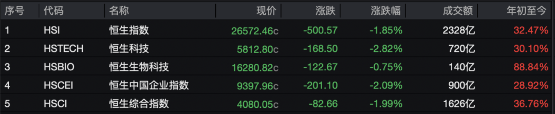 【導(dǎo)讀】三大指數(shù)齊跌,恒生科技指數(shù)重挫2.82%