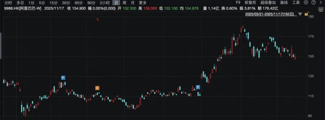 11月17日,阿里巴巴-W逆市收平,成交額達(dá)176.42億港元。