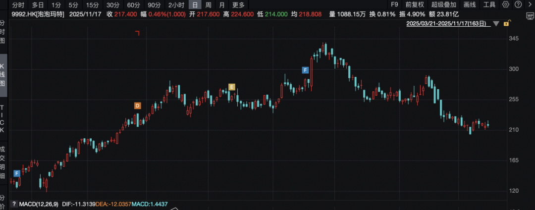 11月17日,泡泡瑪特逆市收漲0.46%。