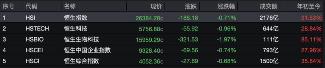 全日大市成交額為2176.13億港元,較前一交易日的2327.88億港元有所減少,南向資金凈買入84.48億港元。電氣設(shè)備、醫(yī)藥生物、有色金屬、化工、銀行板塊等表現(xiàn)疲弱,軟件服務(wù)、大消費(fèi)、煤炭、房地產(chǎn)板塊走強(qiáng)。