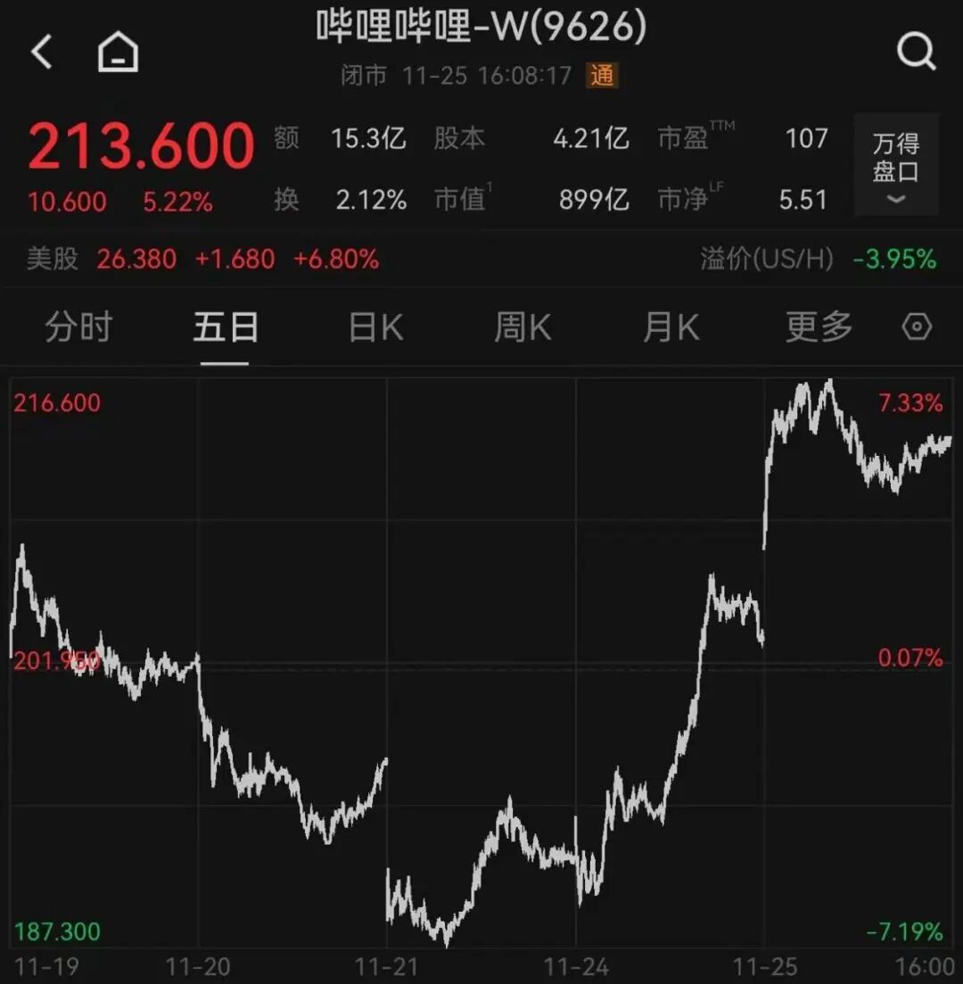 嗶哩嗶哩上漲5.22%,報(bào)收于213.60港元/股。