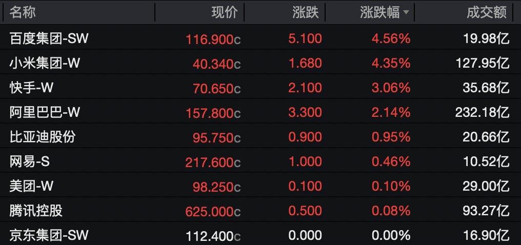 百度集團(tuán)上漲4.56%,小米集團(tuán)上漲4.35%,快手、阿里巴巴、網(wǎng)易、美團(tuán)、騰訊等均收漲。阿里巴巴成交額為232.18億港元,小米集團(tuán)成交額為127.95億港元,騰訊控股成交額接近百億港元。