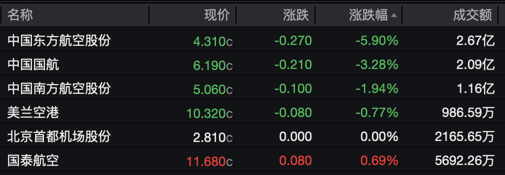 東方航空大跌近6%,中國國航(601111)、南方航空(600029)、美蘭空港均收跌。