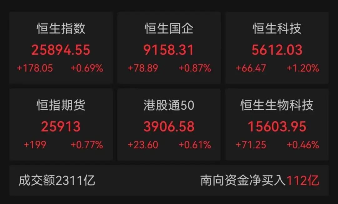 11月25日,港股三大指數(shù)連續(xù)第二日反彈,恒生指數(shù)盤中一度重回26000點(diǎn)上方,收漲0.69%。恒生科技指數(shù)收漲1.20%,恒生國企指數(shù)收漲0.87%。