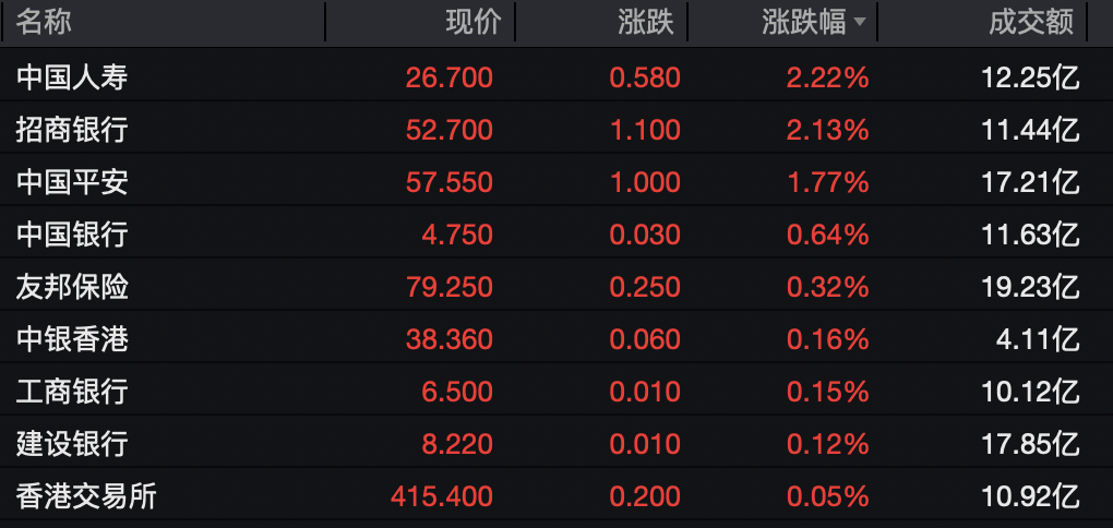 中國人壽(601628)、招商銀行漲幅超2%,中國平安、中國銀行、友邦保險(xiǎn)等均收漲。