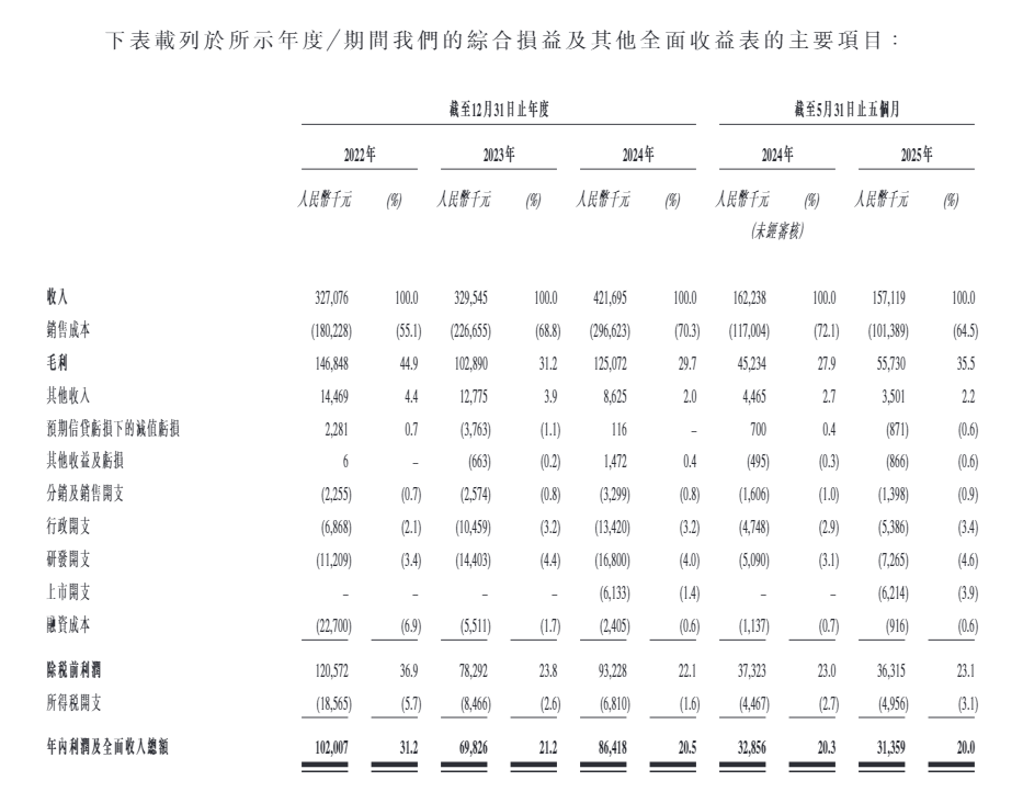 2022年及2023年,海偉股份的收入分別為人民幣3.27億元及人民幣3.30億元。海偉股份的收入由2023年的人民幣3.30億元增長(zhǎng)28.0%至2024年的人民幣4.22億元。海偉股份的收入由截至2024年5月31日止五個(gè)月的人民幣1.62億元減少3.2%至截至2025年5月31日止五個(gè)月的人民幣1.57億元。