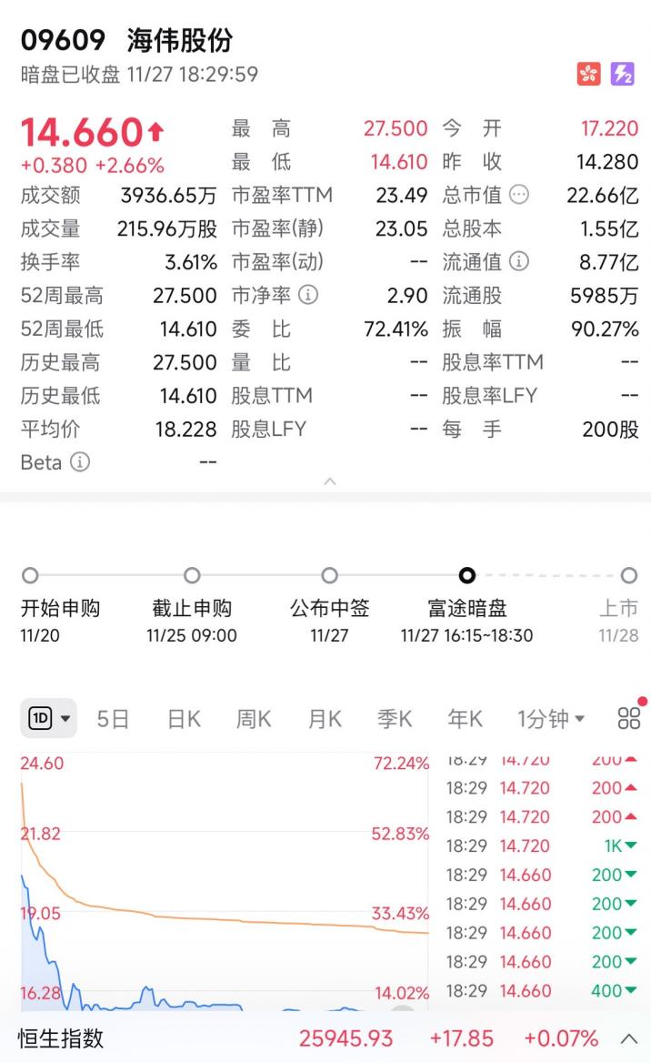 11月27日晚間,即將正式登陸港股市場(chǎng)的中國(guó)第二大電容器薄膜制造商——海偉股份進(jìn)入暗盤(pán)階段。富途牛牛顯示,海偉股份在本次暗盤(pán)中,開(kāi)盤(pán)后一度沖高大漲超90%,隨后一路下滑,最終僅收漲2.66%。