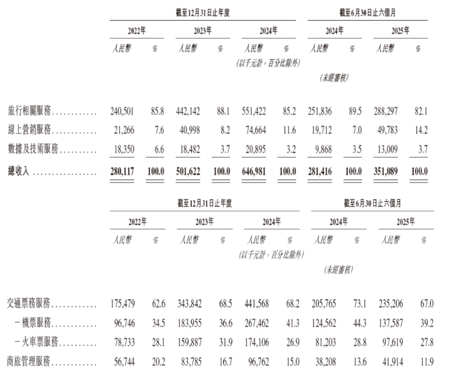 其中,旅行相關(guān)服務(wù)是其營(yíng)收支柱,貢獻(xiàn)了近九成收入,2024年上半年為2.52億元,占比為89.5%;而旅行相關(guān)服務(wù)中包括交通票務(wù)服務(wù)、商旅管理服務(wù)、網(wǎng)約車服務(wù)、住宿預(yù)訂及其他服務(wù)。此業(yè)務(wù)中,交通票務(wù)服務(wù)帶來的收入占比最多,2024年上半年的收入為2.06億元,占比為73.1%。