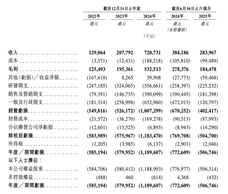 財報顯示,2022年、2023年、2024年該公司分別實現(xiàn)收入1.29億港元、2.08億港元、7.21億港元,分別錄得虧損5.85億港元、5.80億港元、11.90億港元。從2025年中報來看,今年前6個月該公司實現(xiàn)收入2.84億港元,產(chǎn)生虧損5.07億港元。