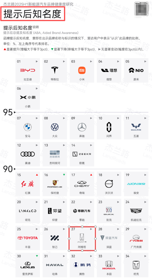 調(diào)研機構(gòu)杰蘭路報告顯示,在出示品牌名稱與標識的前提下,能識別“阿維塔”的受訪者不足90%,而特斯拉、小米、“蔚小理”等品牌的識別率均超過95%。極氪、領(lǐng)克、埃安、零跑等品牌的知名度亦高于阿維塔。