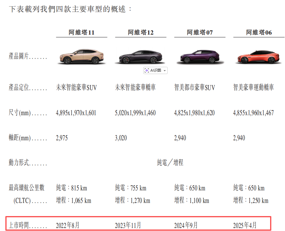申請文件顯示,公司目前在售車型共四款——阿維塔06、07、11、12,售價區(qū)間為20萬至70萬元,覆蓋純電與增程兩種動力形式,涵蓋轎車與SUV品類。