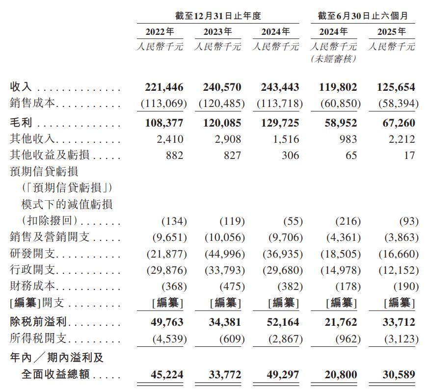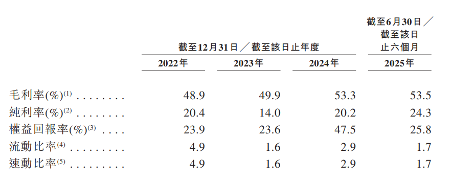 于2022年度、2023年度、2024年度及2025年截至6月30日止六個(gè)月,公司的毛利率分別為48.9%、49.9%、53.3%及53.5%。