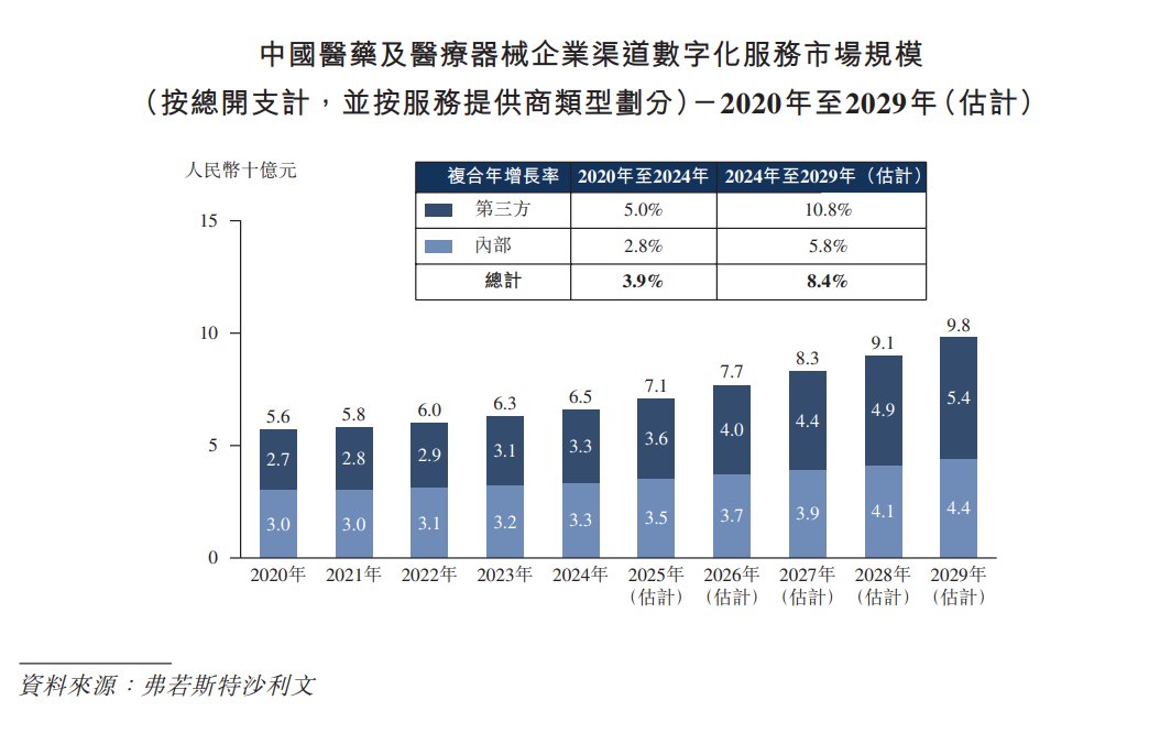 醫(yī)藥及醫(yī)療器械企業(yè)分銷數(shù)字化服務(wù)市場(chǎng)主要分為三個(gè)主要領(lǐng)域:渠道數(shù)字化、營(yíng)銷數(shù)字化及用戶服務(wù)數(shù)字化。2020年至2024年,醫(yī)藥及醫(yī)療器械企業(yè)分銷數(shù)字化服務(wù)的市場(chǎng)規(guī)模由人民幣219億元增至人民幣739億元,期內(nèi)復(fù)合年增長(zhǎng)率為35.5%,并預(yù)計(jì)于2029年進(jìn)一步增至人民幣1,424億元,2024年至2029年的復(fù)合年增長(zhǎng)率為 14.0%。