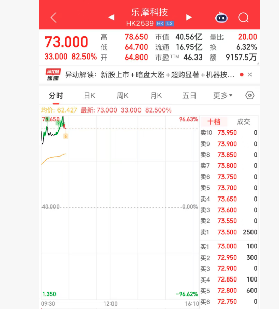 上證報(bào)中國證券網(wǎng)訊(記者 李五強(qiáng))12月3日,樂摩科技(02539.HK)正式登陸港股市場。上市首日,該股一度漲96.63%,最高報(bào)78.65港元/股。截至10時(shí)23分,樂摩科技股價(jià)報(bào)73.00港元/股,漲幅為82.50%。