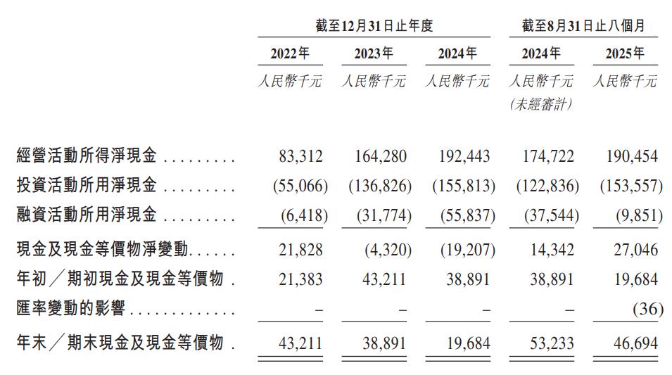 2022年、2023年、2024年、2025年前8月,樂(lè)摩科技經(jīng)營(yíng)活動(dòng)所得凈現(xiàn)金分別為8331.2萬(wàn)元、1.64億元、1.92億元、1.90億元。