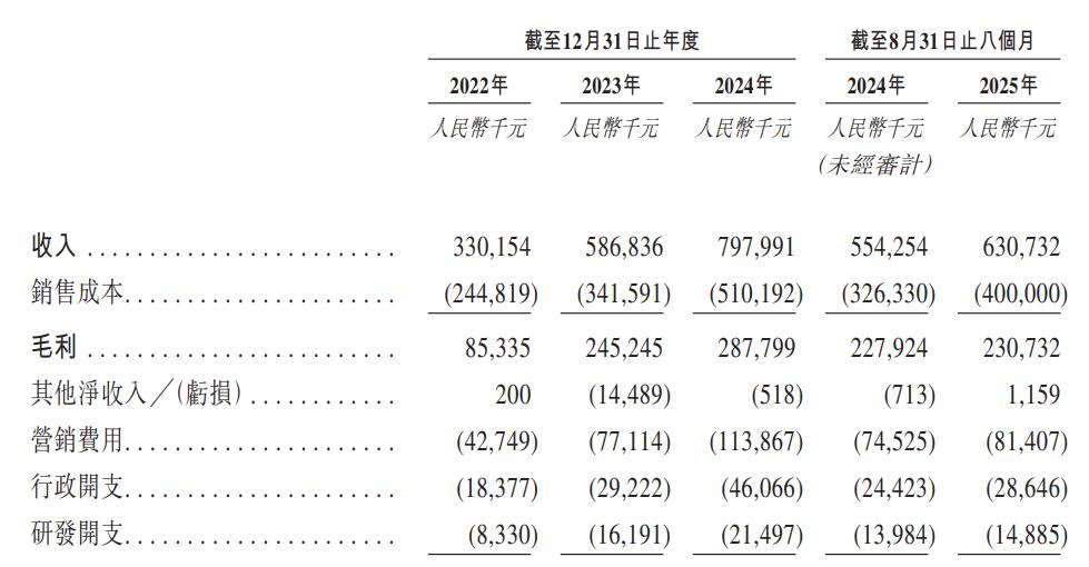 2022年、2023年、2024年、2025年前8月,樂(lè)摩科技實(shí)現(xiàn)收入分別為3.30億元、5.87億元、7.98億元、6.31億元,期內(nèi)利潤(rùn)分別為648.1萬(wàn)元、8734.0萬(wàn)元、8580.7萬(wàn)元、8855.0萬(wàn)元。
