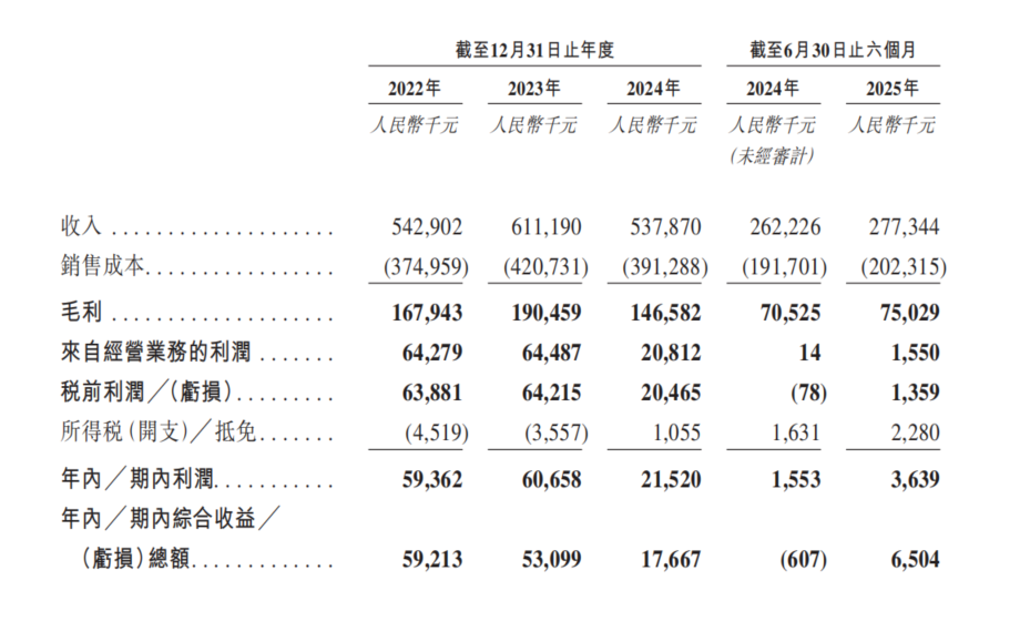 相比營收,凈利潤的波動更為劇烈。2022年和2023年,公司凈利潤穩(wěn)定在5936萬元和6066萬元。然而,2024年凈利潤驟降至2152萬元,降幅達(dá)64.5%。這主要歸因于收入規(guī)模縮減導(dǎo)致規(guī)模效應(yīng)減弱,以及相對剛性的成本結(jié)構(gòu)。2025年上半年凈利潤為363萬元,較去年同期的155萬元同比增長134.2%。