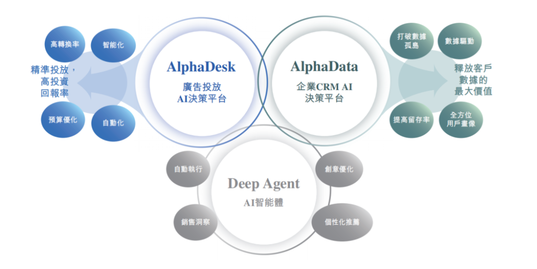 深演智能通過“AlphaDesk”智能廣告投放和“AlphaData”智能數(shù)據(jù)管理雙引擎驅(qū)動業(yè)務(wù),并于近期推出了下一代產(chǎn)品“Deep Agent”。