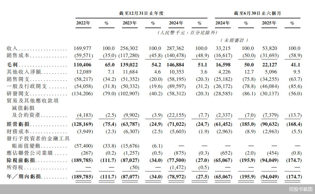 2022—2024年,這家公司營收逐年上漲,分別是1.7億元、2.56億元、2.87億元,經調整凈虧損逐年收窄,從1.32億元減少到6808.1萬元,再到2024年的4306.5萬元。但到了2025年上半年經調整凈虧損轉向相反方向,虧損加劇。