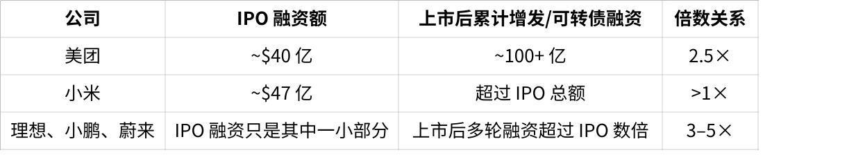 因此,上市的意義并不只是拿到一筆錢,而是讓公司從此進(jìn)入一個(gè)可持續(xù)的融資體系,能夠在之后不斷通過二次發(fā)行、配股、發(fā)債、可轉(zhuǎn)債等方式獲得長期資金支持。同時(shí),上市公司的身份也會(huì)提升其機(jī)構(gòu)合作能力,增強(qiáng)監(jiān)管層和金融體系對它的信任,讓它更容易成為行業(yè)基礎(chǔ)設(shè)施的一部分。歷史經(jīng)驗(yàn)也證明,絕大多數(shù)公司的融資來源并不依賴 IPO 本身,IPO 往往只占總?cè)谫Y額的十分之一到三分之一,真正的資金都來自上市后的多輪再融資。上市不是終點(diǎn),而是融資能力的起點(diǎn)。
