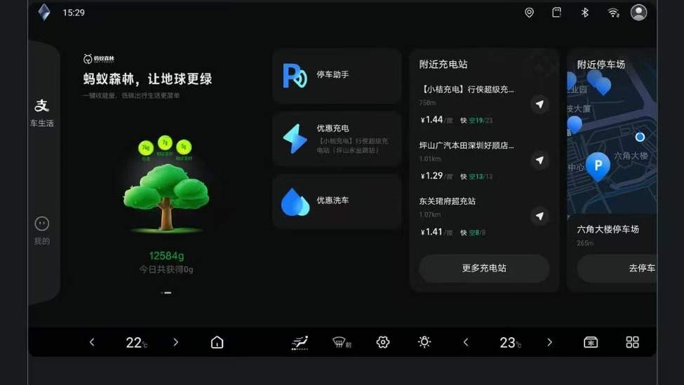 另一項新增功能為“車生活-螞蟻森林”。用戶登錄支付寶賬號后,可在車機小程序或桌面卡片直接收取螞蟻森林綠色能量,用于兌換品牌專屬權益。