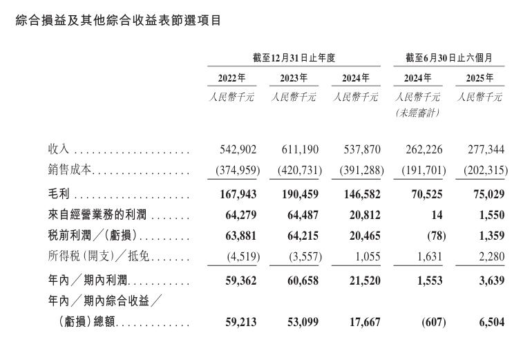 2022年、2023年、2024年以及2025年上半年,公司分別實(shí)現(xiàn)營(yíng)業(yè)收入約5.43億元、6.11億元、5.38億元以及2.77億元的收入。2022年、2023年、2024年以及2025年上半年,公司的凈利潤(rùn)分別約0.59億元、0.61億元、0.22億元及0.036億元。