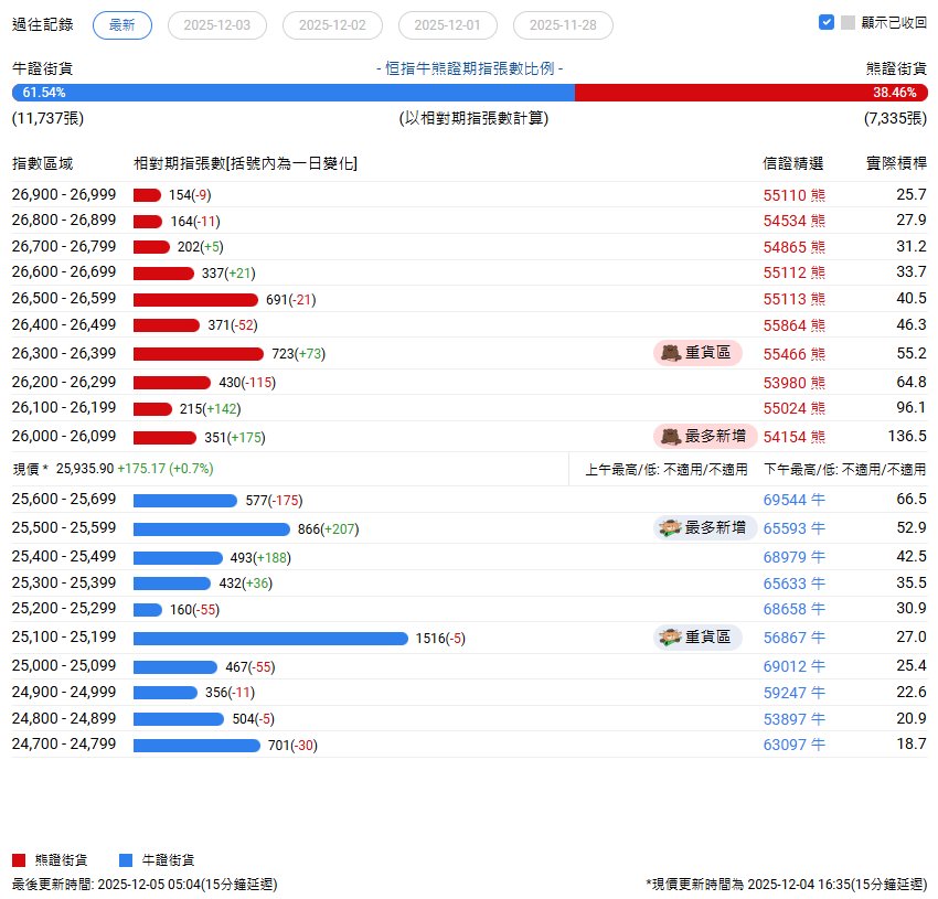 截至12月5日,恒指最新的牛熊街貨比例為62:38。
