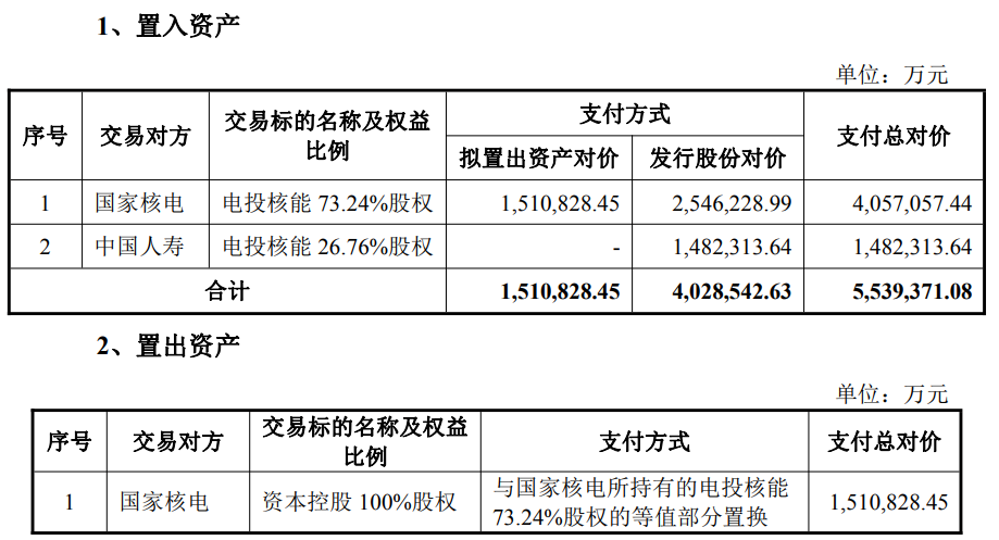 本次交易的擬置入資產為國家核電及中國人壽(601628)合計持有的電投核能100%股權,擬置出資產為上市公司所持的資本控股100%股權。上市公司擬以所持的資本控股100%股權與國家核電所持有的電投核能股權的等值部分進行置換;針對置入資產和置出資產的差額部分,由上市公司發(fā)行股份向國家核電及中國人壽購買。