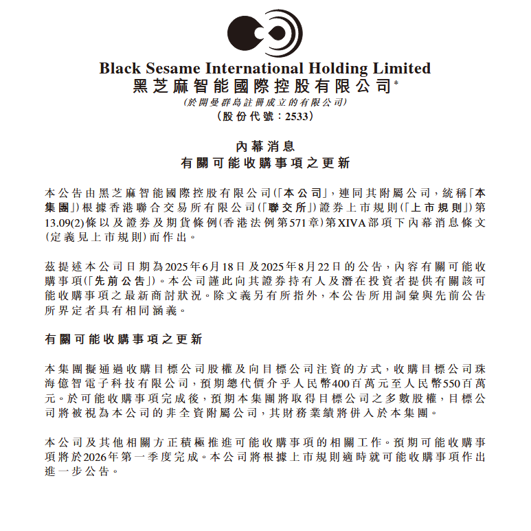 公告稱,黑芝麻智能擬通過(guò)股權(quán)收購(gòu)及注資方式收購(gòu)億智電子,預(yù)期總代價(jià)約人民幣4億元至5.5億元。收購(gòu)?fù)瓿珊,億智電子將成為黑芝麻智能的非全資附屬公司,其財(cái)務(wù)業(yè)績(jī)將正式并入集團(tuán)報(bào)表,預(yù)期交易將于2026年第一季度完成。