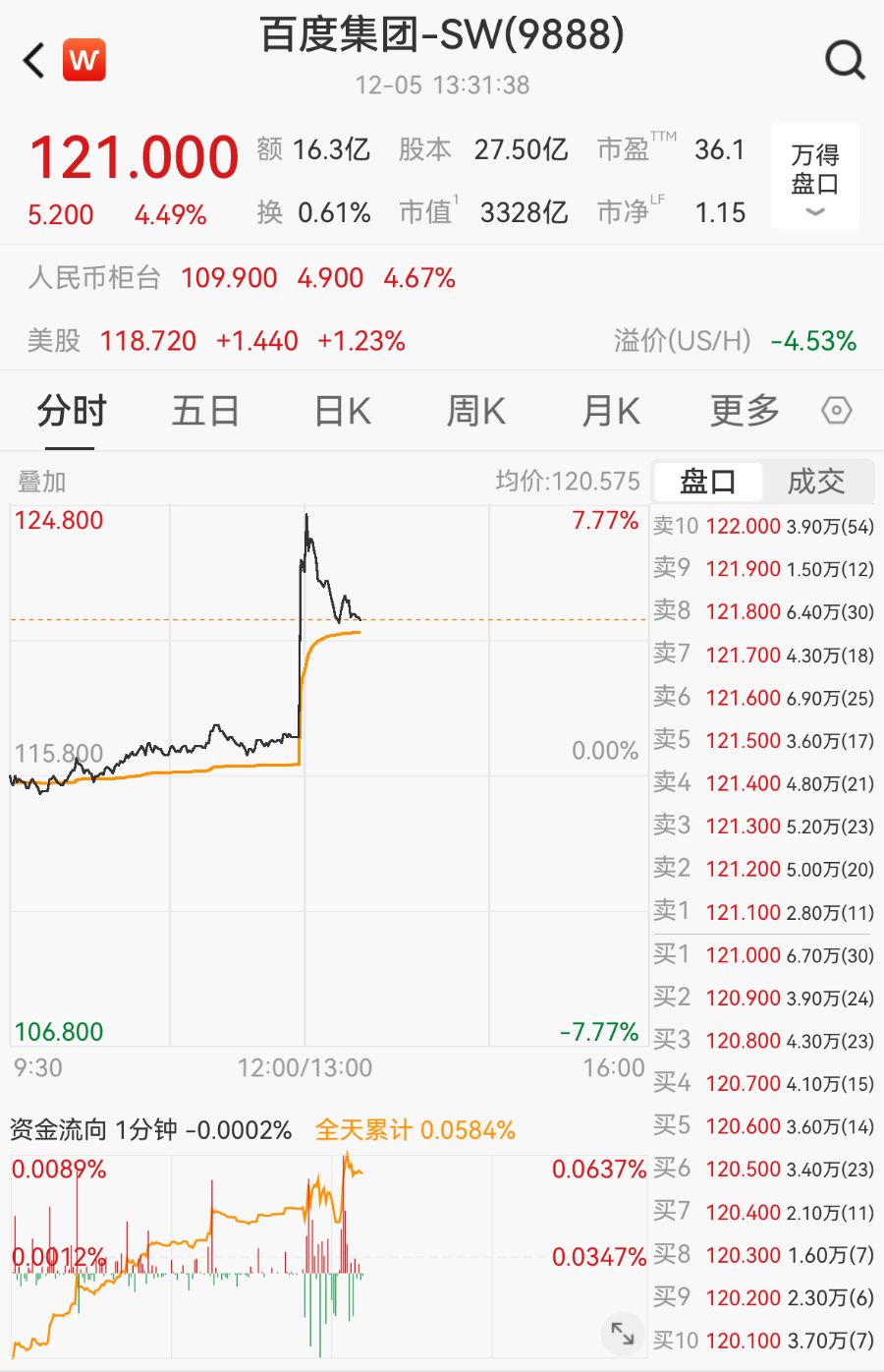 12月5日,百度港股午后突然直線拉漲,1分鐘漲近5%,隨后漲幅收窄,截至13:31,漲4.49%,報121港元/股,總市值為3328億港元。