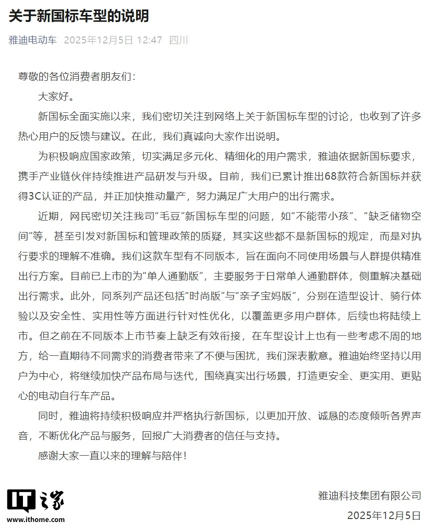 雅迪科技集團有限公司今日發(fā)布關(guān)于新國標車型的說明,IT之家附全文如下: