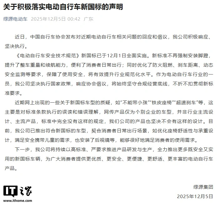 IT之家 12 月 5 日消息,綠源電動車今日發(fā)布《關(guān)于積極落實電動自行車新國標(biāo)的聲明》,IT之家附原文如下: