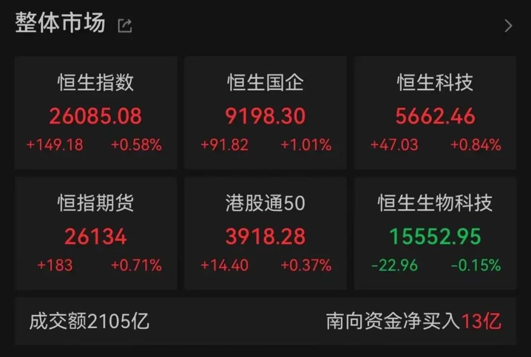 12月5日,港股三大指數(shù)午后持續(xù)拉升轉(zhuǎn)漲,全天呈現(xiàn)低開高走行情。截至收盤,恒生指數(shù)上漲0.58%,再度站上26000點;恒生國企指數(shù)、恒生科技指數(shù)分別上漲1.01%、0.84%。