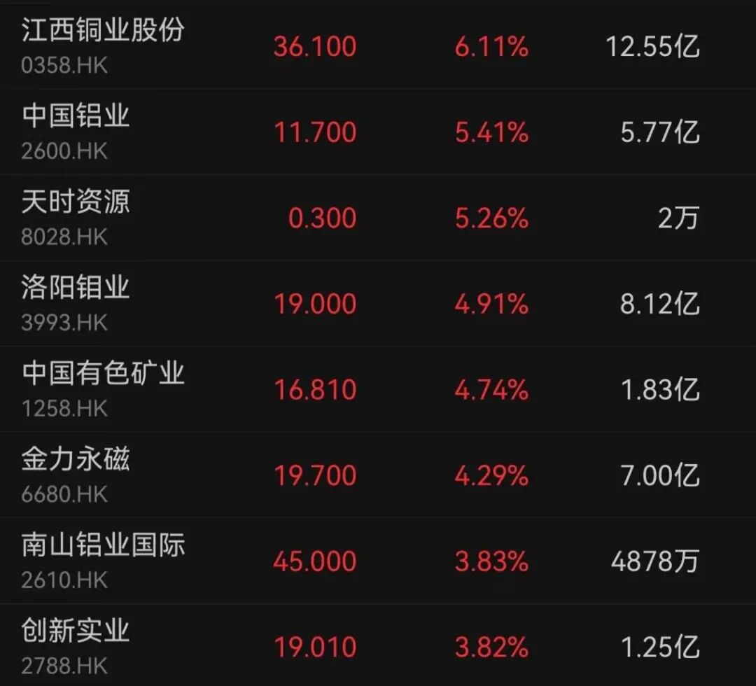 截至收盤,江西銅業(yè)(600362)股份上漲6.11%、中國鋁業(yè)(601600)上漲5.41%、金力永磁(300748)上漲4.29%。