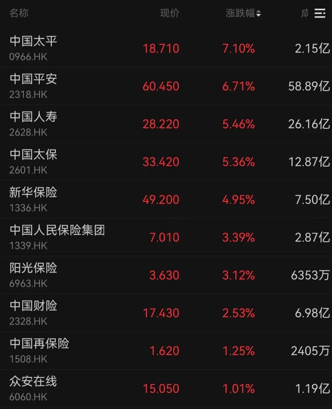大金融板塊中,保險股漲幅最為靠前。中國太平漲超7%,中國平安漲6.71%。