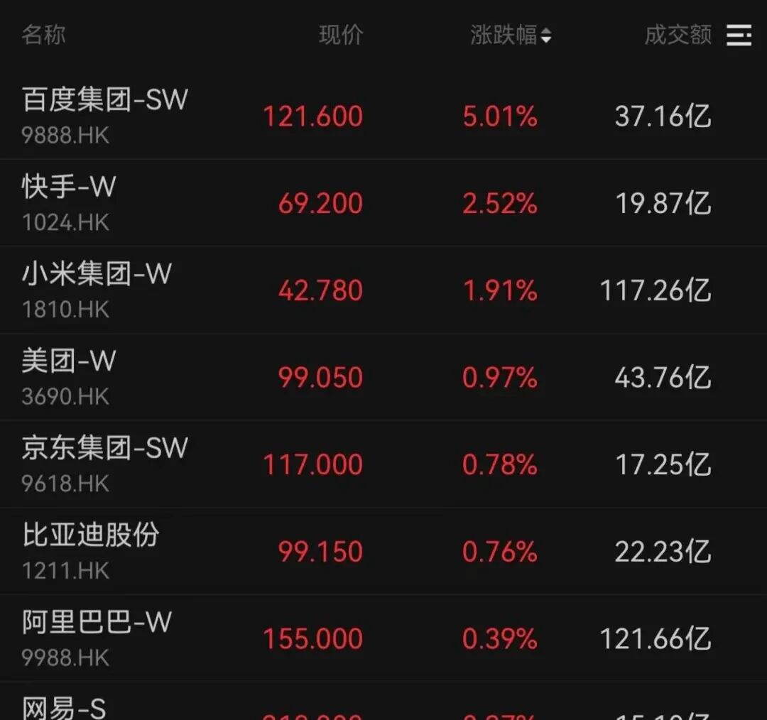 百度漲超5%,領(lǐng)漲科技龍頭股;快手、小米、美團等均收漲。