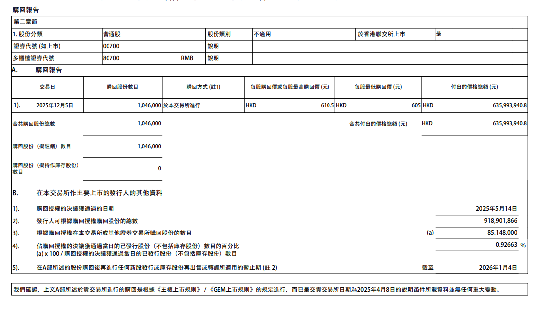12月5日,香港聯(lián)交所公告文件顯示,騰訊控股(00700.HK)斥資6.36億港元回購(gòu)104萬(wàn)股股份。