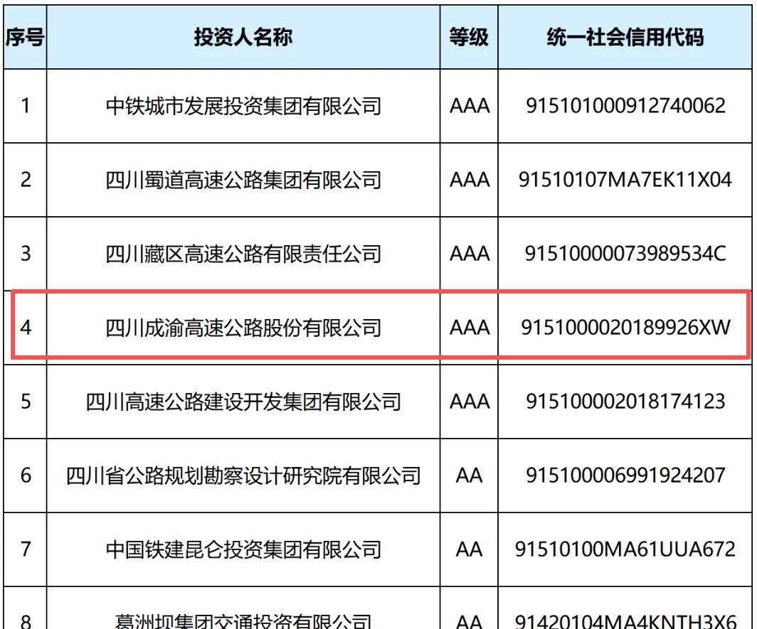 成渝公司獲評四川省高速公路投資人AAA信用評級