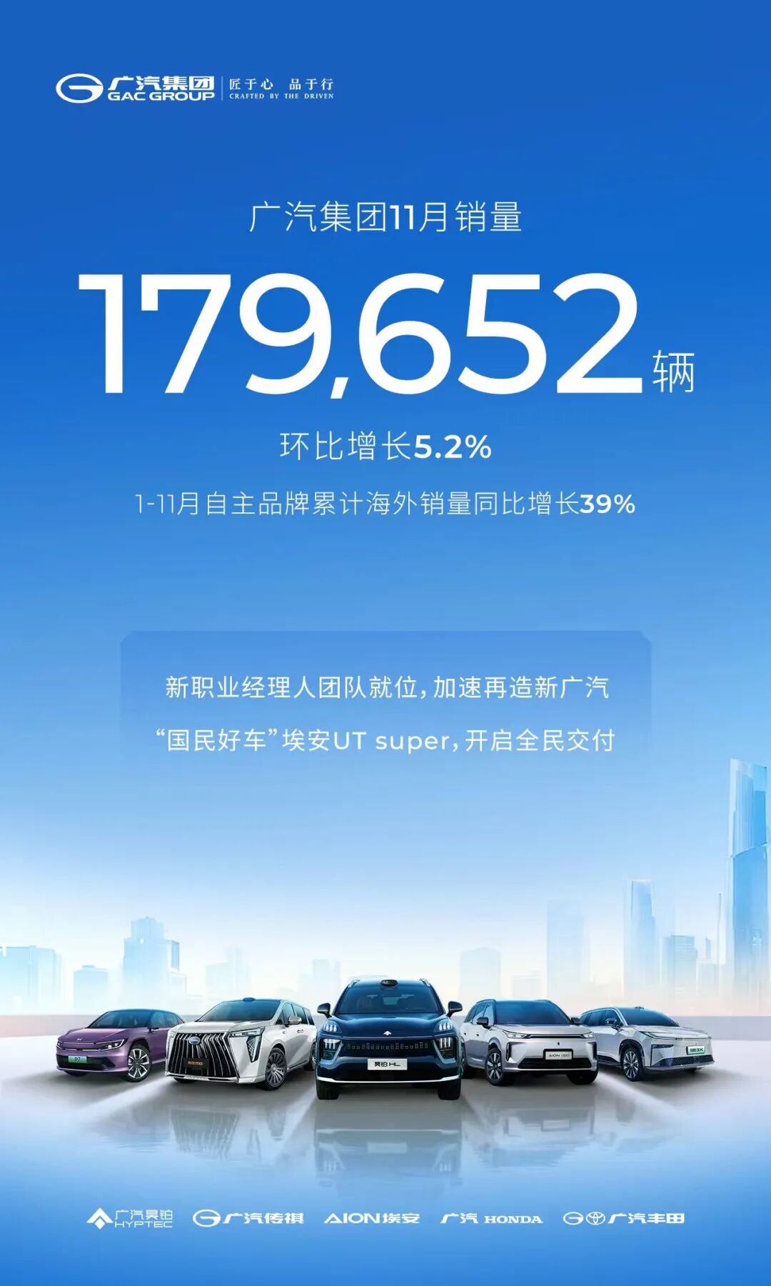 今年11月,廣汽集團繼續(xù)深化智能化、高端化布局,多個主力車型銷量回升,帶動旗下五大整車品牌表現(xiàn)逐步向好。