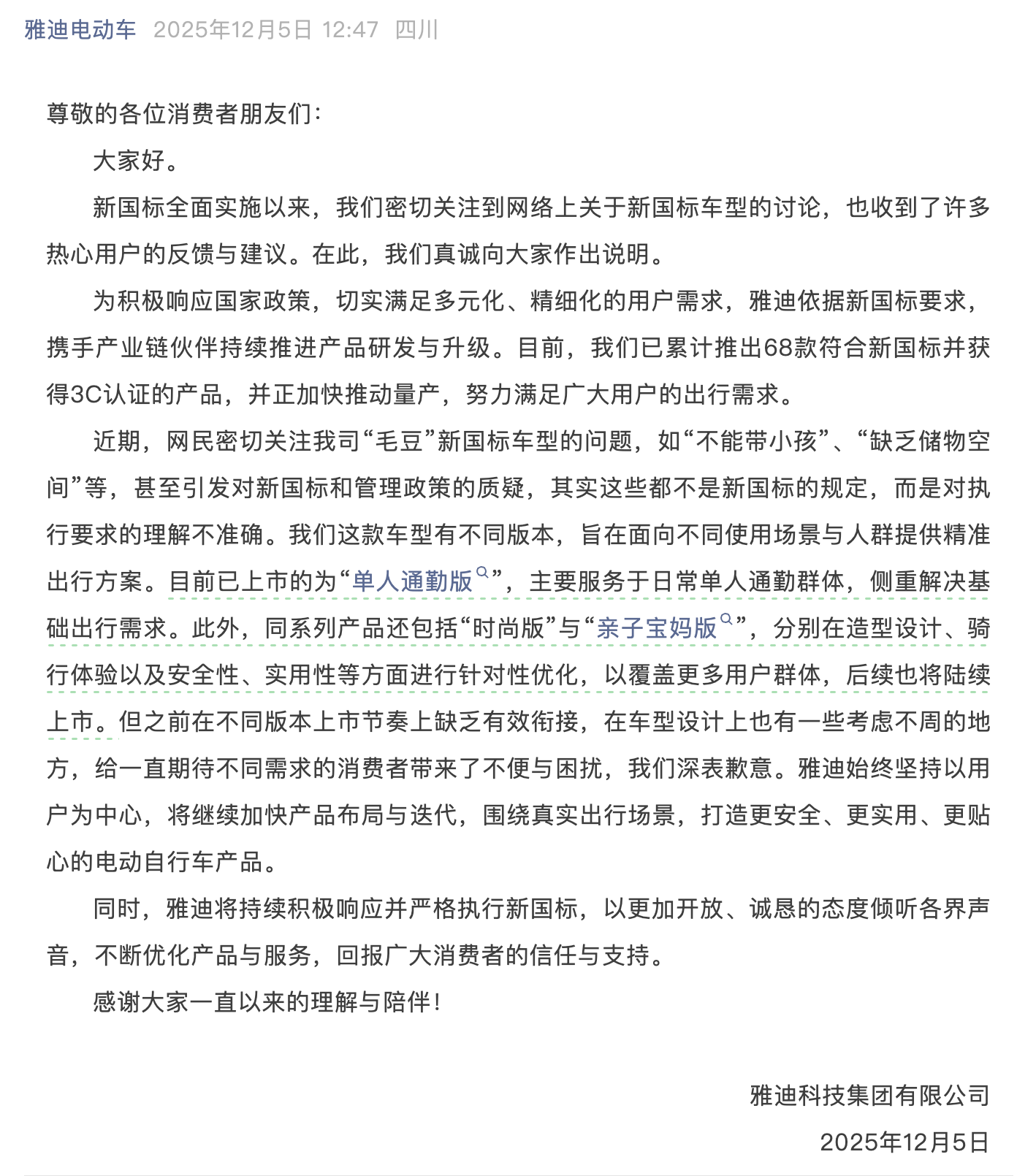 12月5日下午,雅迪電動車發(fā)文道歉,“之前在不同版本上市節(jié)奏上缺乏有效銜接,在車型設(shè)計上也有一些考慮不周的地方,給一直期待不同需求的消費者帶來了不便與困擾。”