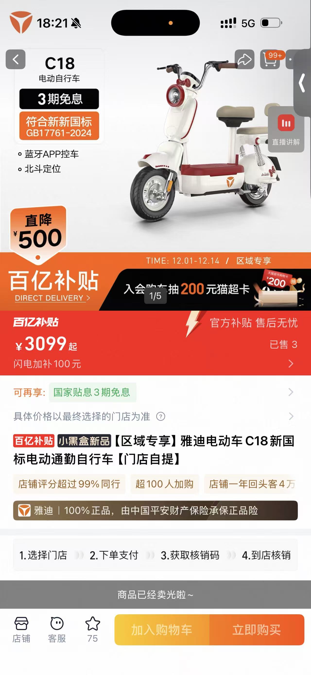 觀察者網(wǎng)注意到,雅迪電動車天貓旗艦店中,上線的“新國標電動自行車”顯示已售罄。