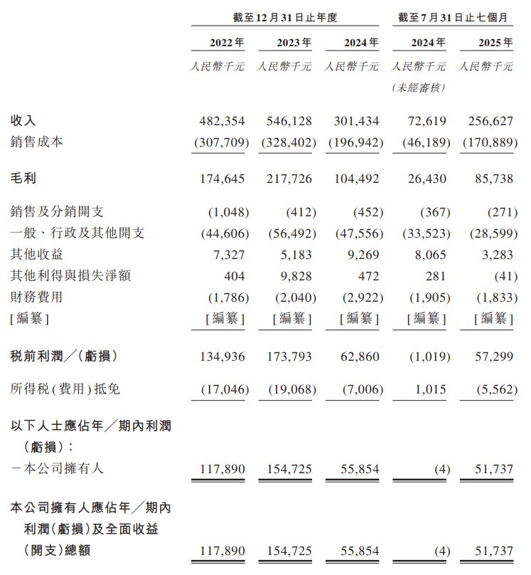 財(cái)務(wù)方面,于2022年度、2023年度、2024年度以及2025年1-7月,公司分別錄得收入4.82億元(人民幣,下同)、5.46億元、3.01億元以及2.57億元;同期,錄得公司擁有人應(yīng)占年內(nèi)利潤及全面收益總額1.18億元、1.55億元、5585.4萬元以及5173.7萬元。