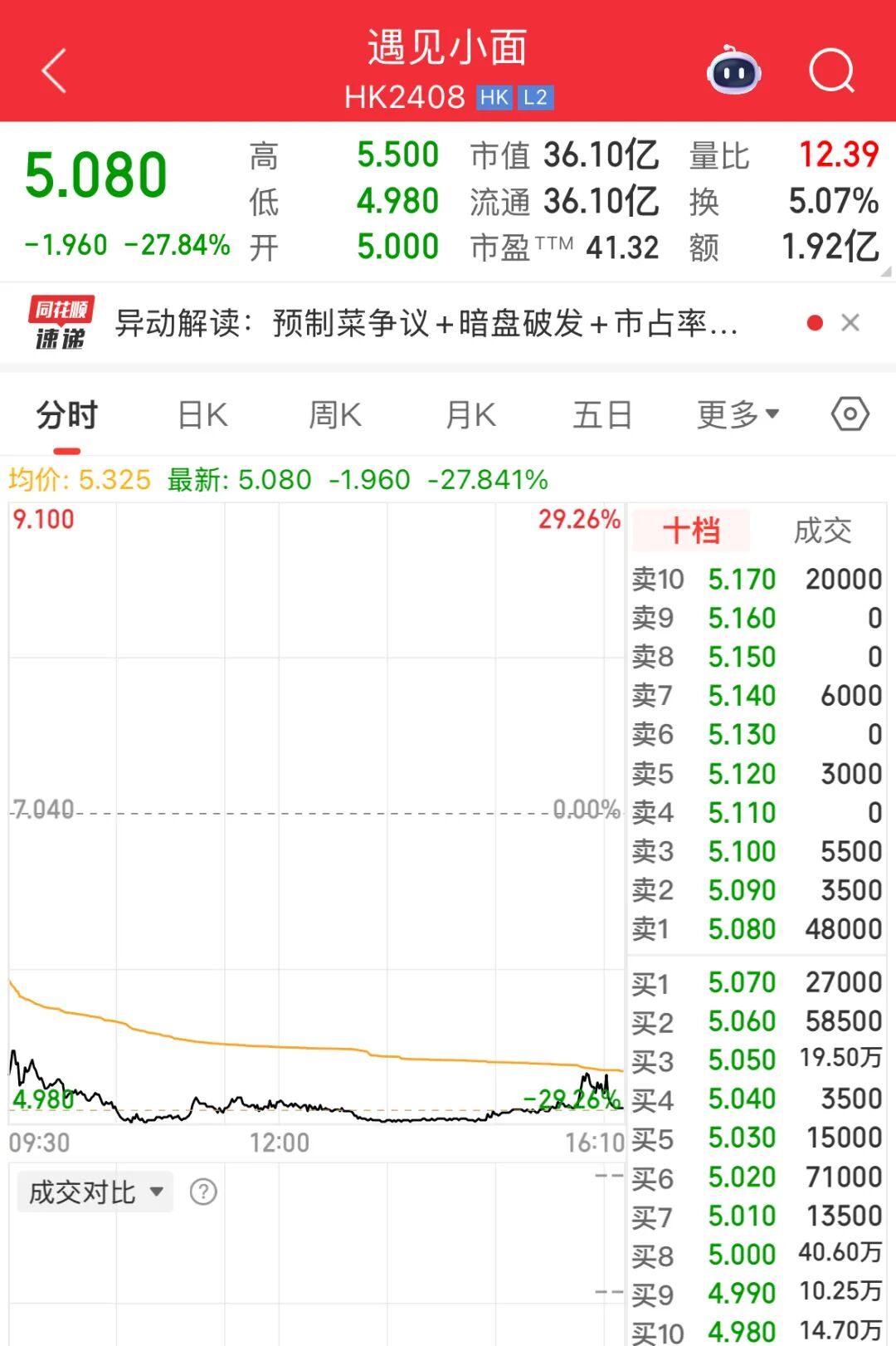 遇見小面以5港元/股的價格開盤,較發(fā)行價(7.04港元)大跌28.98%,后續(xù)股價持續(xù)低位震蕩,最終報收5.08港元,跌幅收窄至27.84%,對應(yīng)總市值36.1億港元。